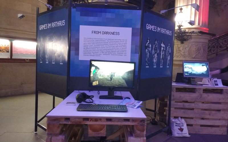 From Darkness will be presentet at the exhibition "Spiele in der Diele" in Rathaus Hamburg from 3 to 7pm, where visitors can play and discuss various digital games that deal with politics, escape, war, gender roles and more.