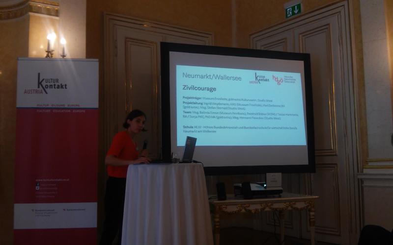 Die Ergebnisse unseres Zivilcourage-Workshops (in Kollaboration mit Museum Fronfeste und Studio West) an der HLW Neumarkt wurden am 08.06. 2018 im Rahmen der Veranstaltung "Nicht von gestern! Projekte kultureller Bildung zu 100 Jahren österreichischer Geschichte" ( veranstaltet von Haus der Geschichte Österreich & KulturKontakt Austria) im Bundesministerium für Bildung, Wissenschaft und Forschung im Palais Starhemberg präsentiert.